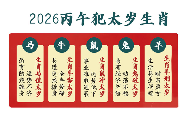 属鼠人在2026年冲太岁,冲代表冲击与变动。本年易有重大变化,如搬家、换工作、转行、人际关系紧张、健康波动、外出易遇矛盾,凡事须稳中求进。1936、1948、1960、1972、1984、1996、2008、2020年出生。